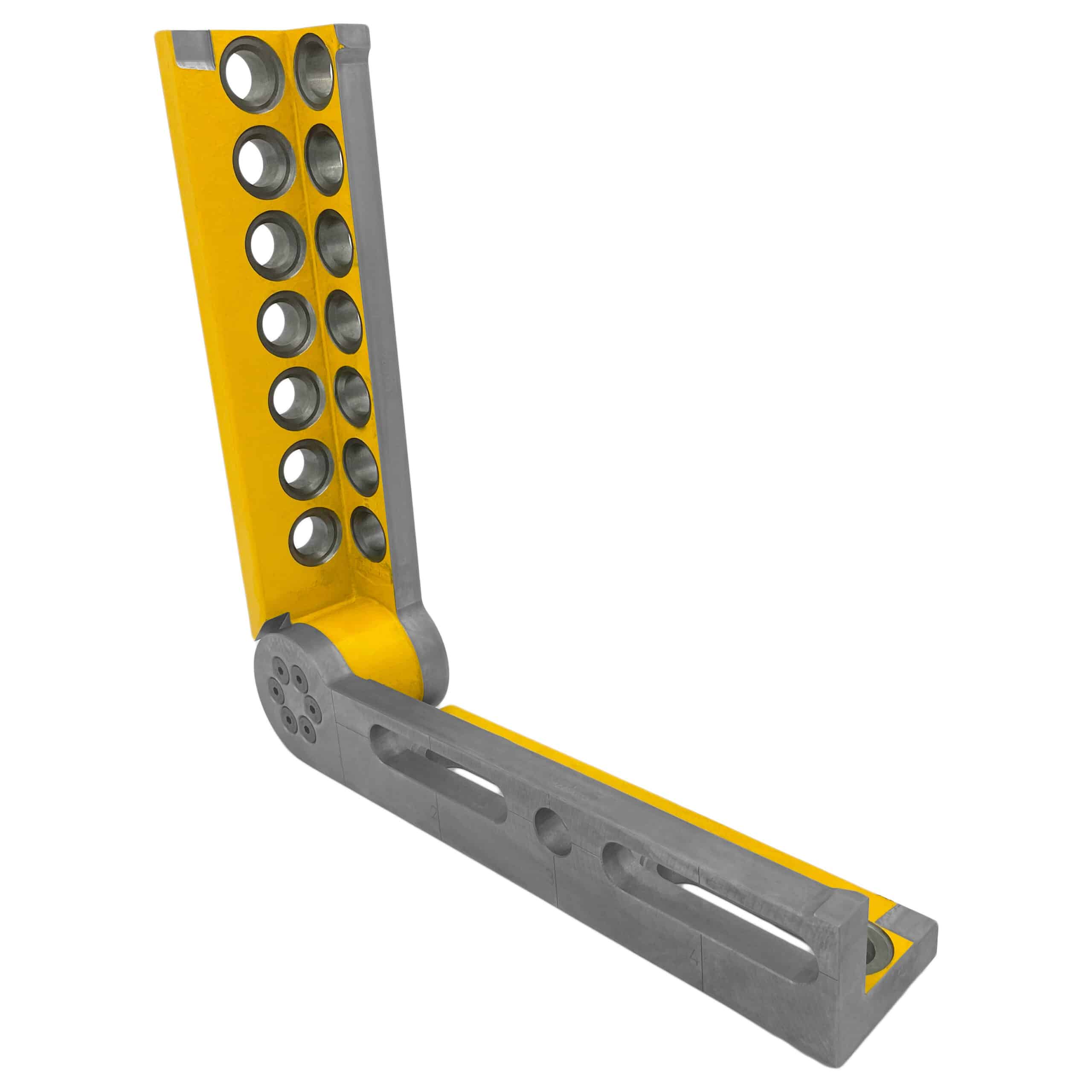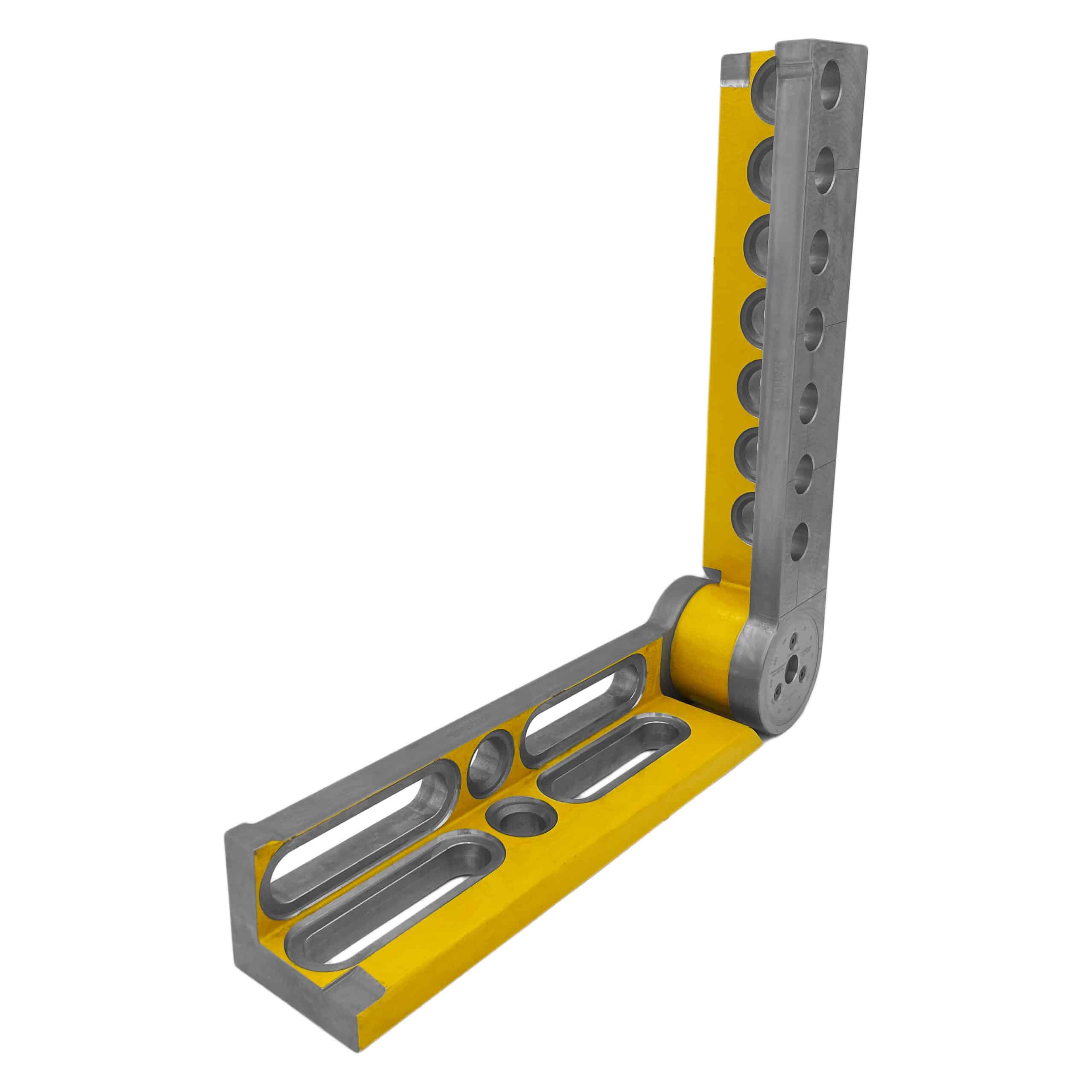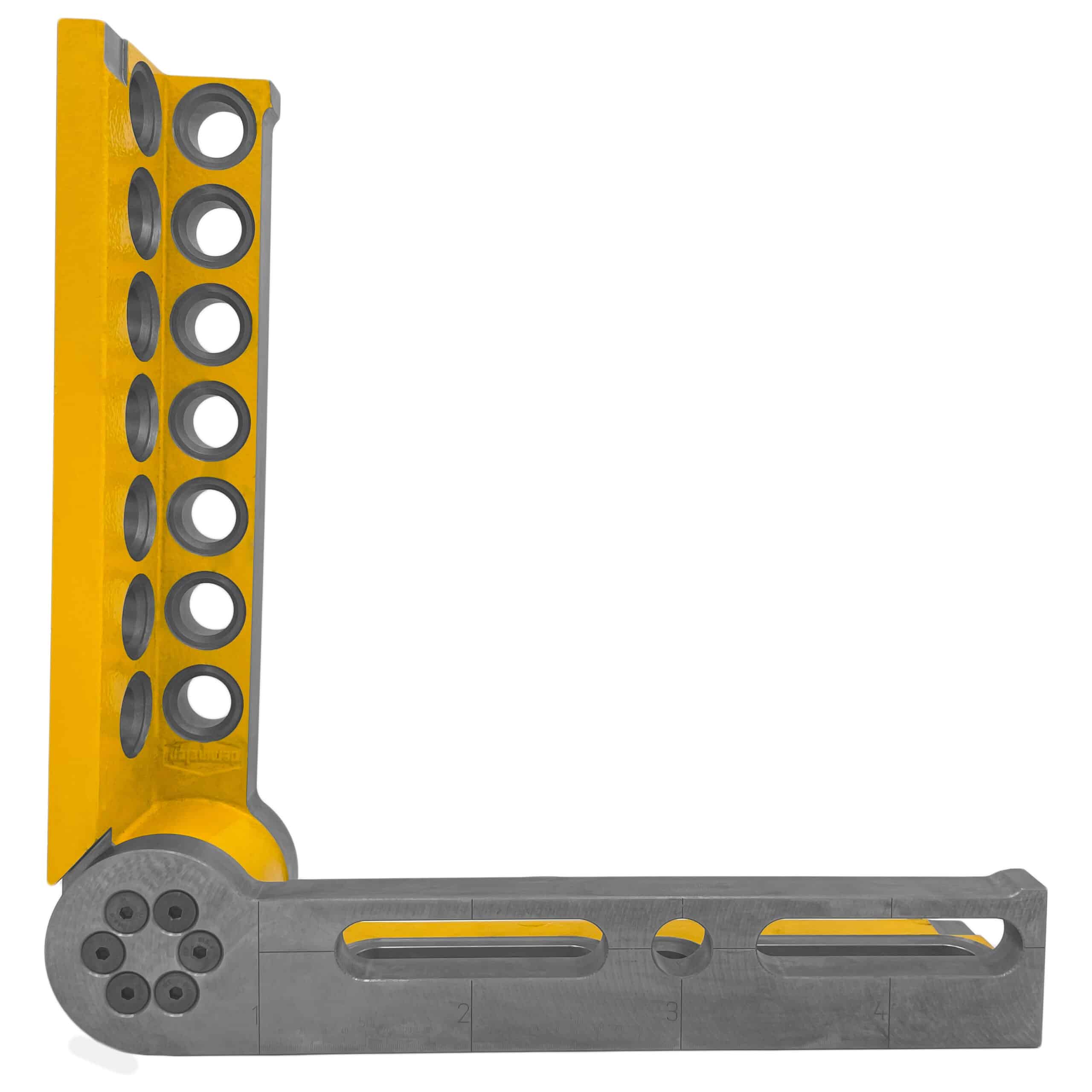 The Universal Pivot & Tilt Angle (RH) is engineered for versatile positioning with a continuously adjustable range between 0° and 225°. It features 1mm precision scaling and grid lines for maximum precision clamping, allowing for accurate dimension adjustments on the 3D worktable. The hydromechanical clamping system supports up to 1600Nm torque and is maintenance-free, ensuring reliable performance. Its combination of system bores and oblong holes offers numerous application possibilities. With the ability to be used both horizontally and vertically, and larger dimensions than part 3008 for added versatility and stability, it is a robust choice for demanding tasks. The hex screw allows for precise angle adjustments using a 14mm Allen key.