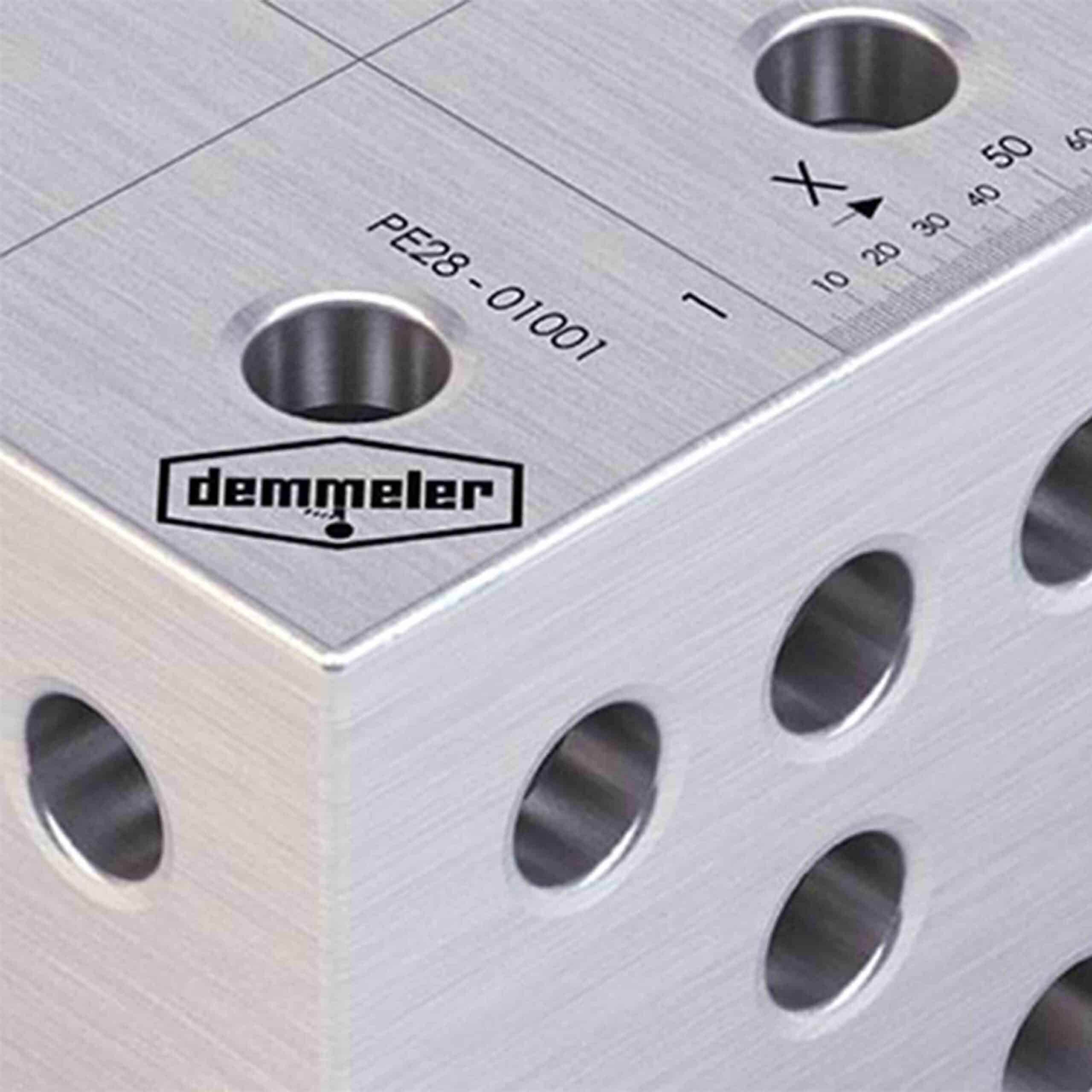 The table features a recessed Demmeler logo on all 4 side plates, DEMONT 760 M hardened construction ensuring long-lasting durability, and all system bores include a new protective countersink for enhanced design and functionality. Its optimised table edges and additional cross-ribs provide superior reinforcement for heavy-duty tasks.